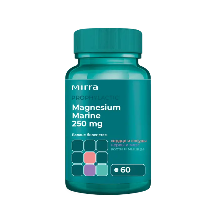 Магний — важный элемент для здоровья нервной и сердечно-сосудистой систем. БАД «Мирра-Магний» содержит в суточной дозе (2 капсулы) 250 мг оксида магния морского происхождения (в т. ч.137 мг биодоступного магния) и 4 мг витамина В6 для лучшего усвоения.